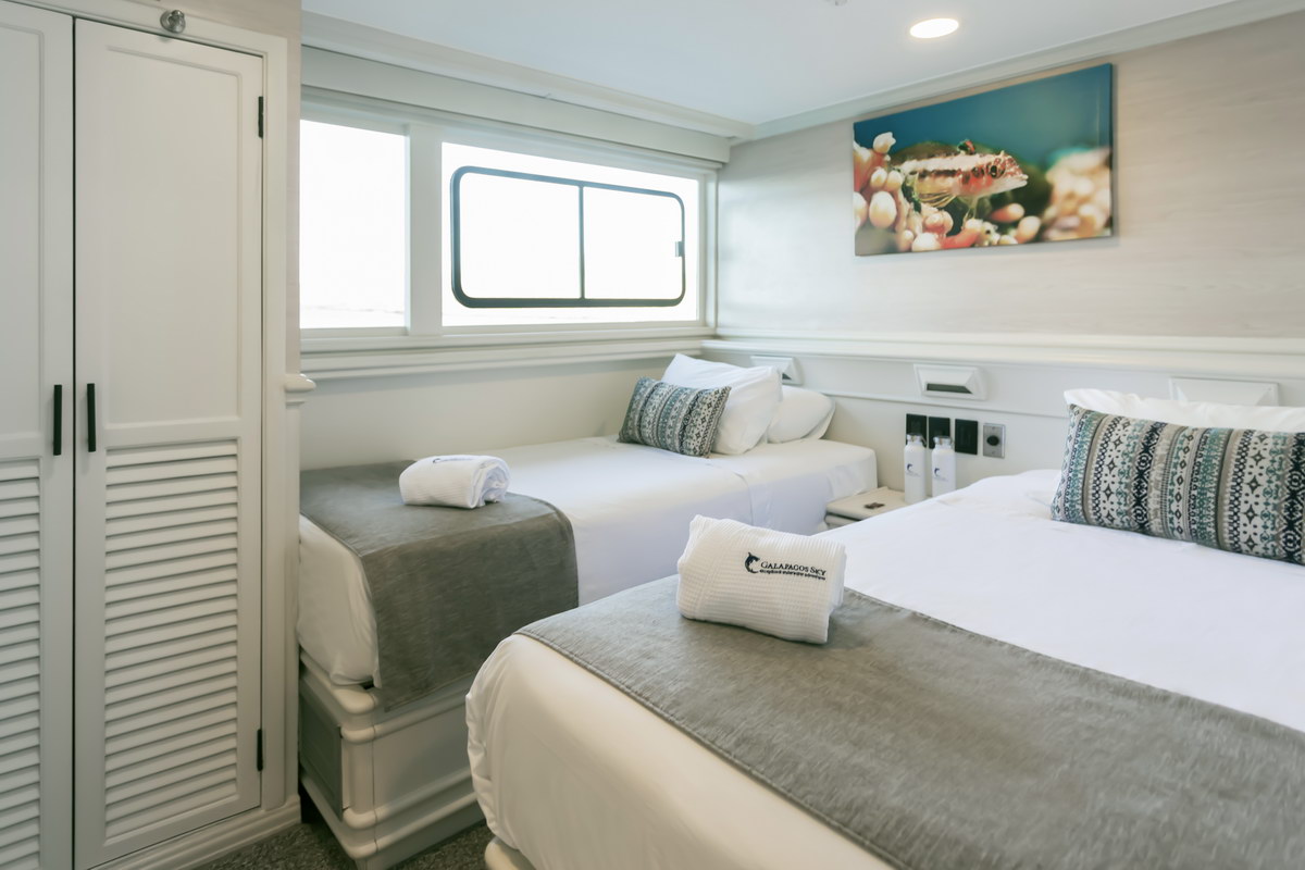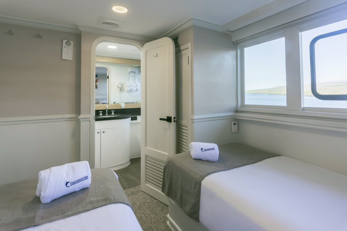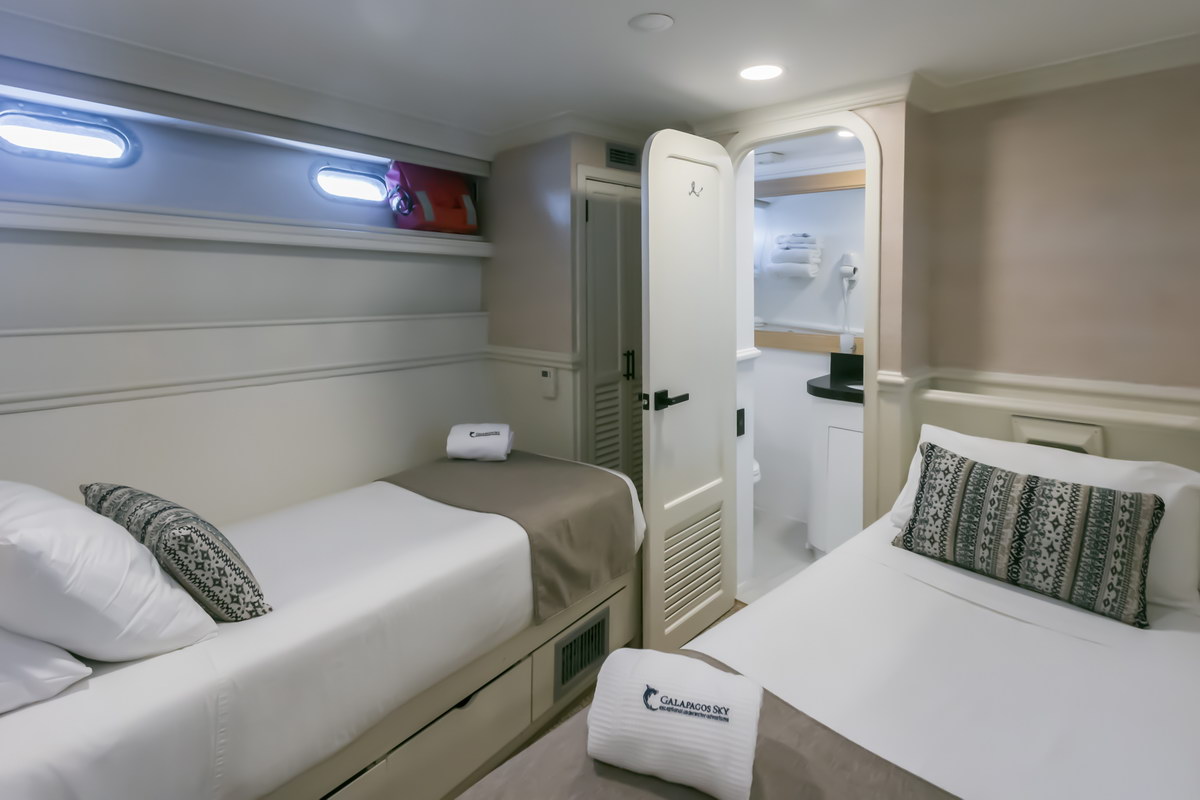 Die Galápagos Sky verfügt über insgesamt acht Kabinen für Doppelbelegung, alle mit eigenem Bad. Vier Master-Kabinen befinden sich auf dem Oberdeck und sind mit zwei Einzelbetten ausgestattet, die zu einem Doppelbett zusammengestellt werden können. Große Fenster sorgen für Tageslicht und Ausblick. Die vier Deluxe-Kabinen liegen auf dem Unterdeck und verfügen über zwei Einzelbetten sowie Bullaugen.