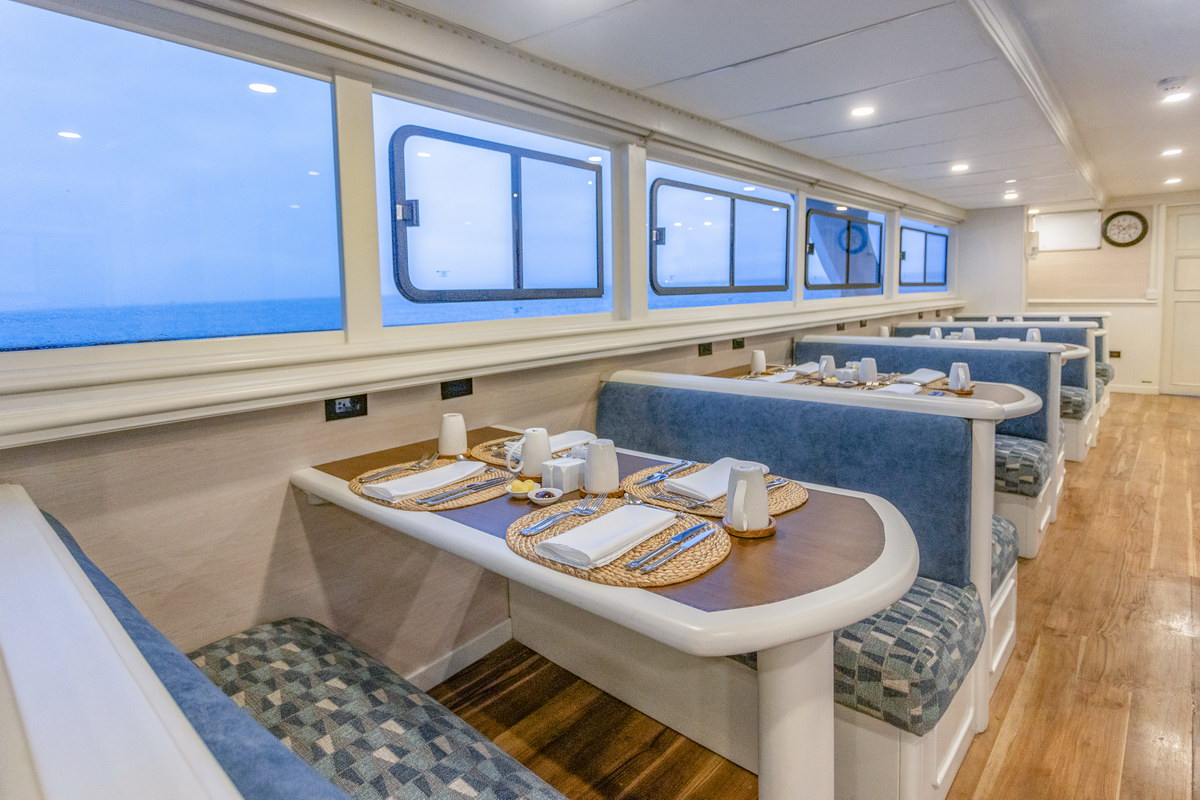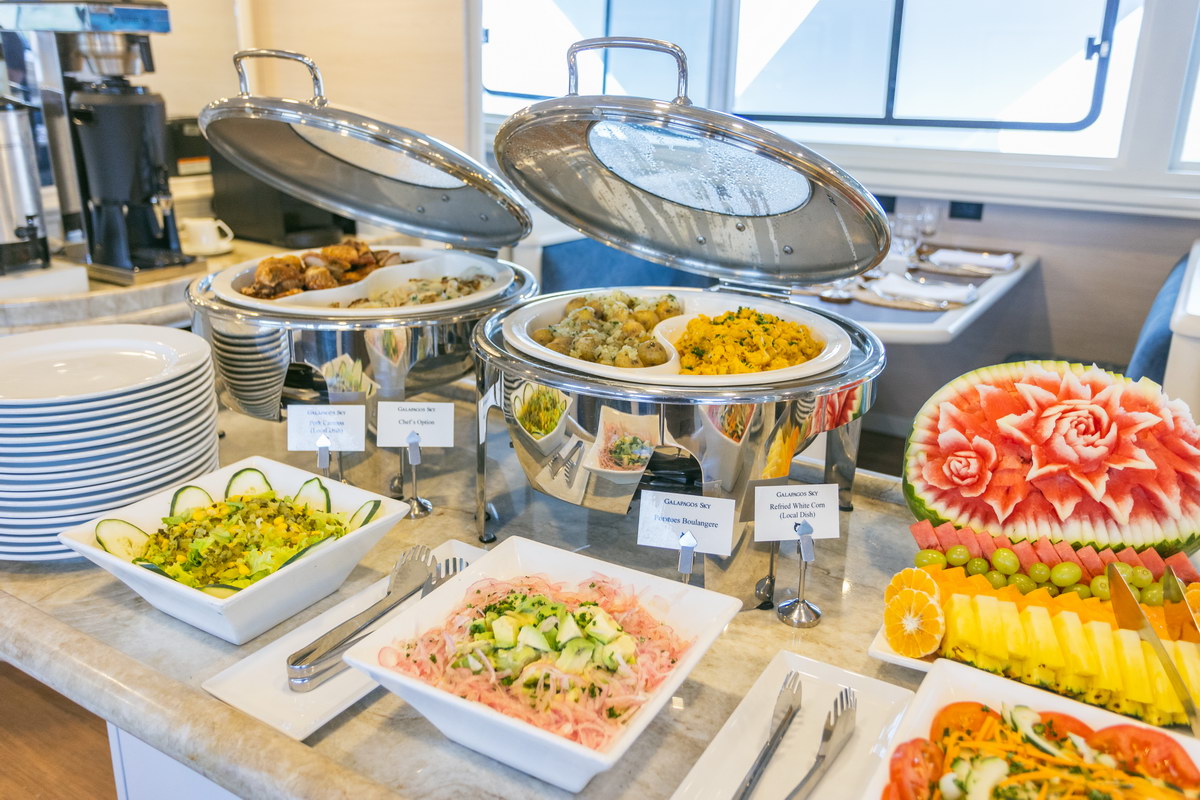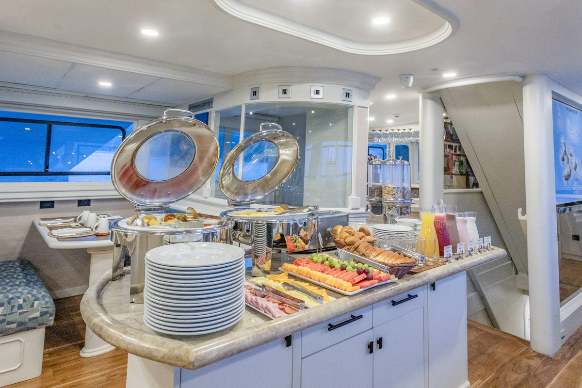 Die Küche an Bord ist auf den täglichen Tauchbetrieb abgestimmt und legt Wert auf frische Zubereitung sowie eine ausgewogene Auswahl. Die Menüs kombinieren internationale Küche mit regionalen Einflüssen, wobei ein Großteil der Zutaten aus Ecuador und den Galápagos-Inseln stammt. Frühstück und Mittagessen werden in Buffetform angeboten, das Abendessen wird als mehrgängiges Menü am Tisch serviert.
