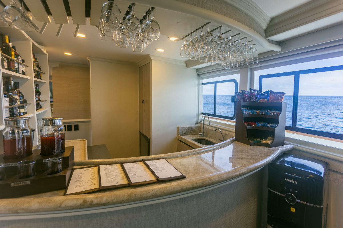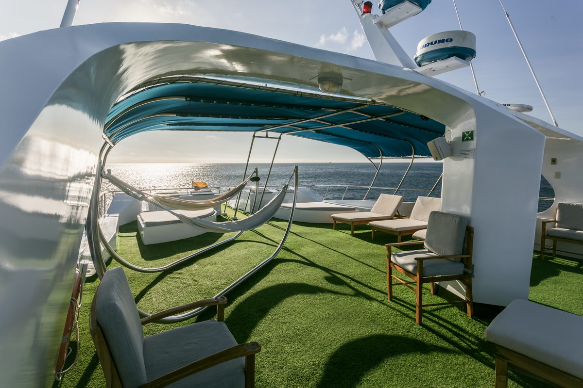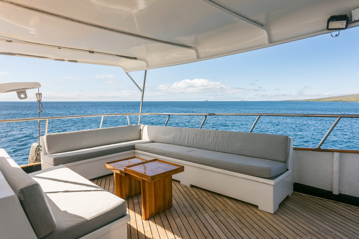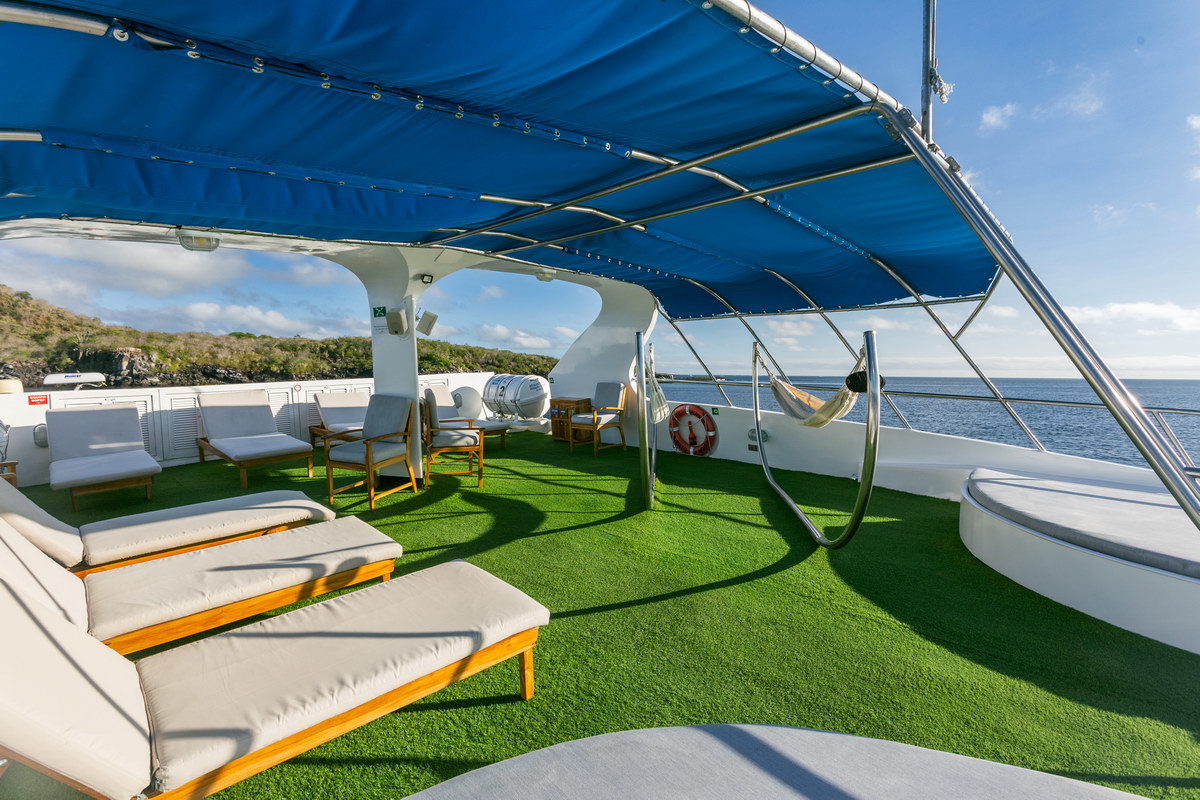 Auf dem Oberdeck befindet sich ein Sonnendeck mit Liegen und Sitzmöglichkeiten. Die Innen- und Außenbereiche können während der gesamten Reise genutzt werden. An Bord steht Stromversorgung im nordamerikanischen Standard zur Verfügung. Eine Internetverbindung über Satellit ist vorhanden, ihre Nutzung und Stabilität sind jedoch abhängig von der Position des Schiffs und können insbesondere in abgelegenen Regionen eingeschränkt sein. Die Crew besteht aus nautischem Personal, Tauchguides und Servicekräften mit Erfahrung im Galápagos-Gebiet.