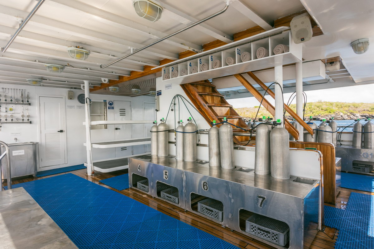Das Tauchdeck ist funktional organisiert und bietet feste Plätze für die persönliche Ausrüstung. Spülmöglichkeiten für Tauchequipment und Kameras sowie Frischwasserduschen stehen zur Verfügung. Tanks und Gewichte sind an Bord vorhanden. Nitrox wird für entsprechend zertifizierte Taucher angeboten. Ein eigener Tauchcomputer ist für alle Teilnehmer erforderlich.