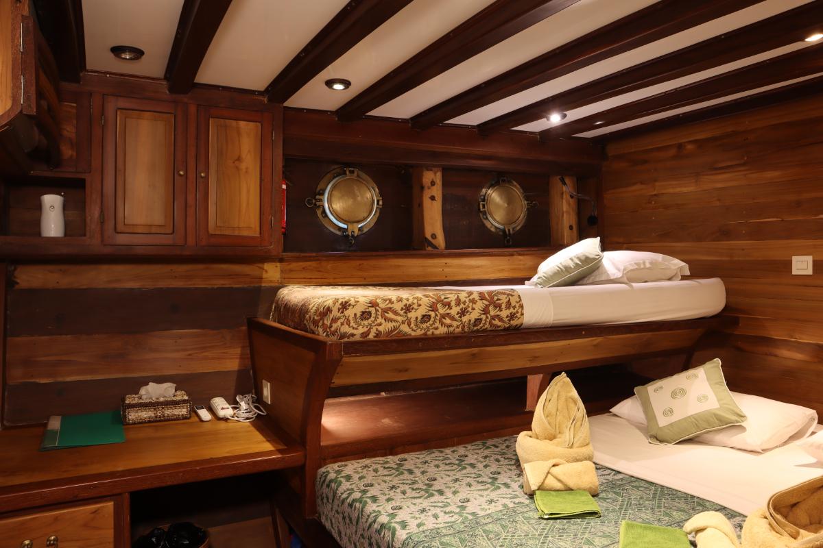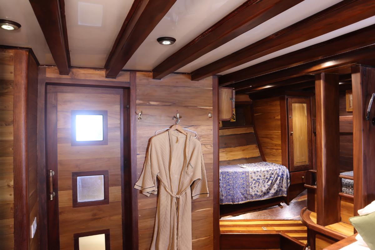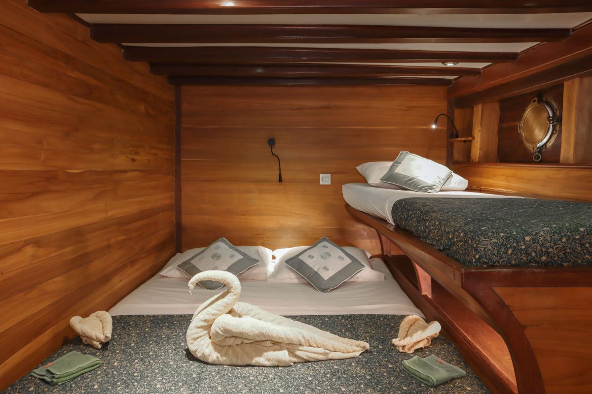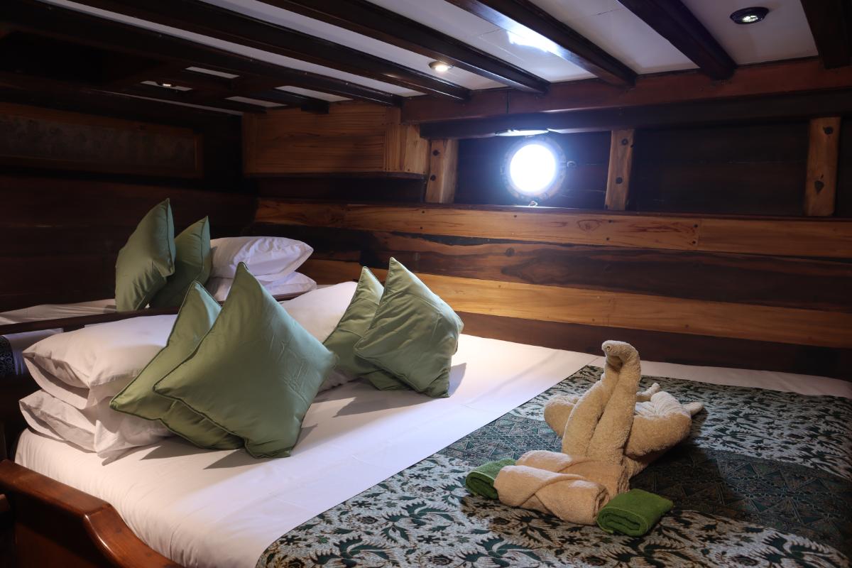 Die beiden Deluxe Lower Deck Kabinen sind identisch gestaltet und jeweils mit einem Queensize-Bett sowie einem zusätzlichen Einzelbett ausgestattet. Auch hier steht den Gästen ein eigenes Badezimmer mit Dusche, WC und Warmwasser zur Verfügung.