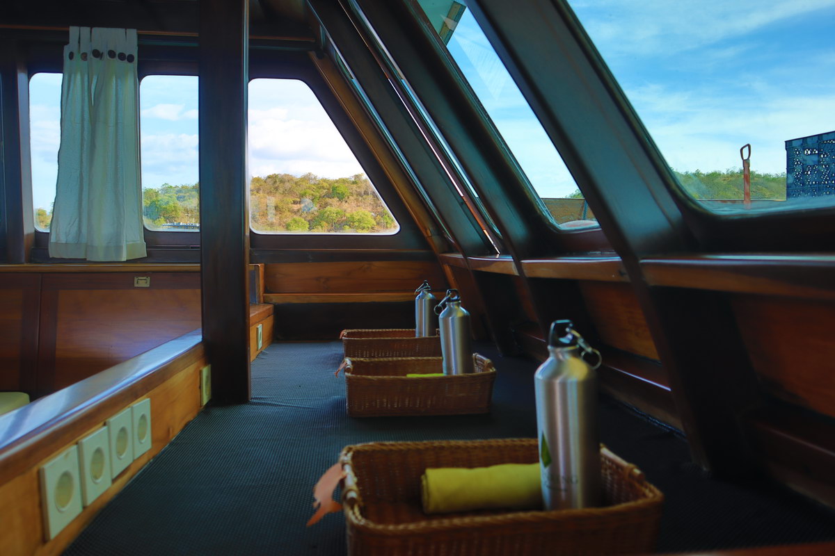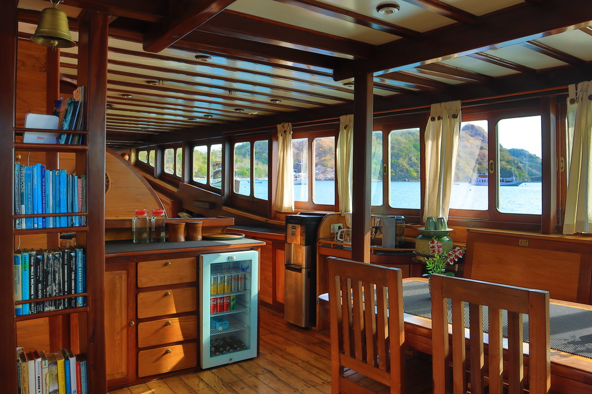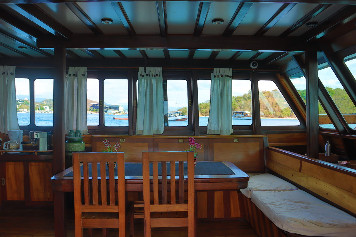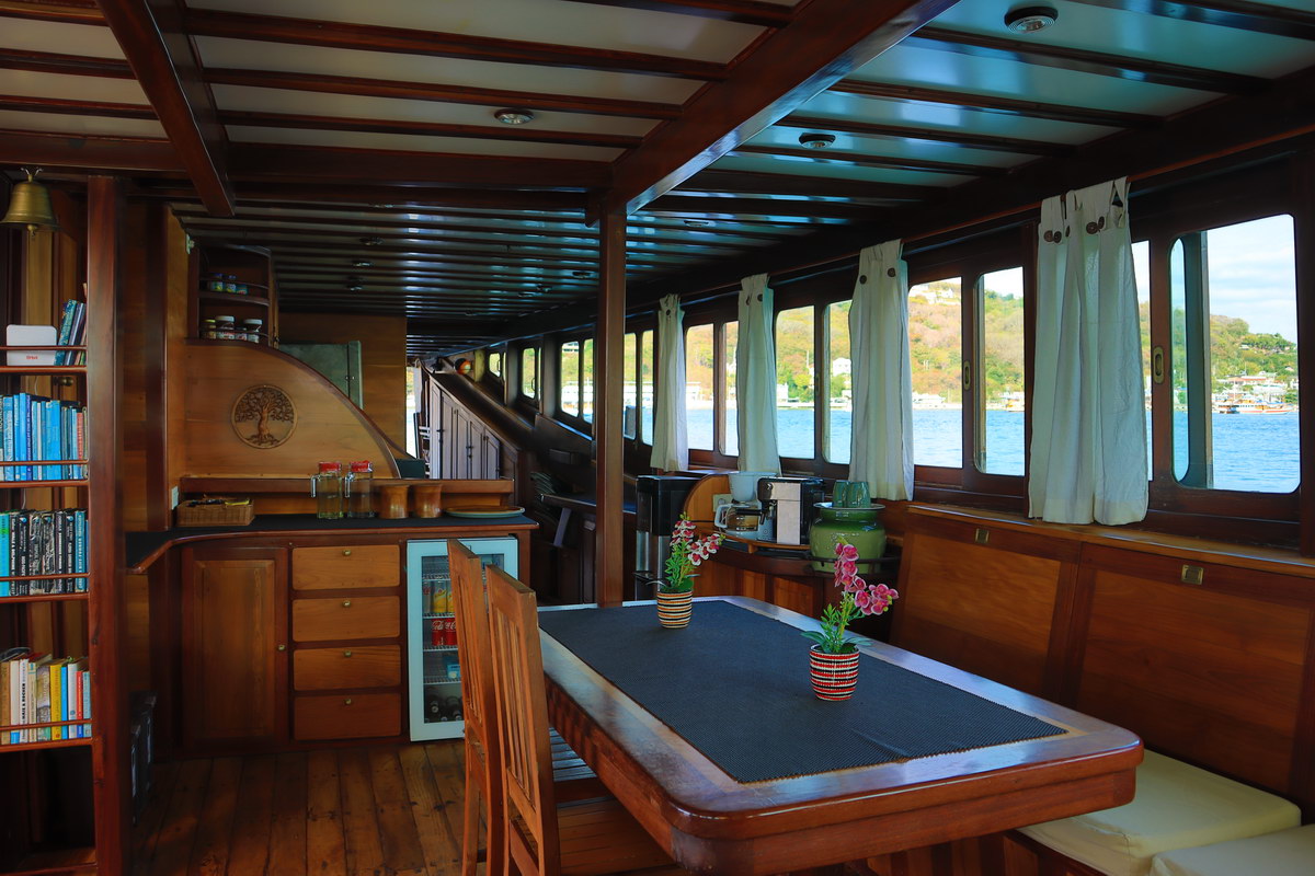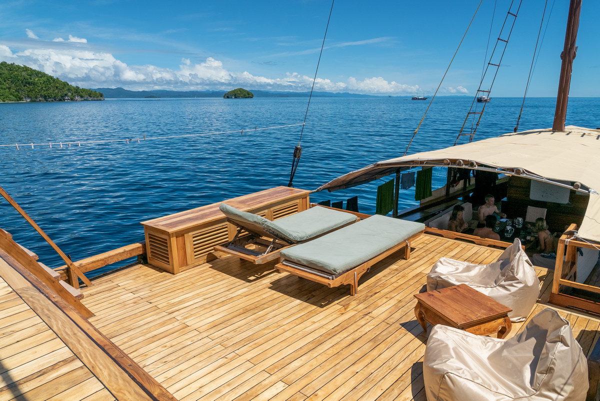 Auf den Außendecks stehen den Gästen mehrere Aufenthaltsbereiche zur Verfügung, die sowohl sonnige als auch schattige Plätze bieten. Das großzügige Sonnendeck lädt zum Entspannen zwischen den Aktivitäten ein, während der überdachte Außenbereich ein zentraler Treffpunkt für Mahlzeiten und gesellige Stunden mit Blick auf das Meer ist. Hier lässt sich die vorbeiziehende Inselwelt Indonesiens besonders intensiv erleben.