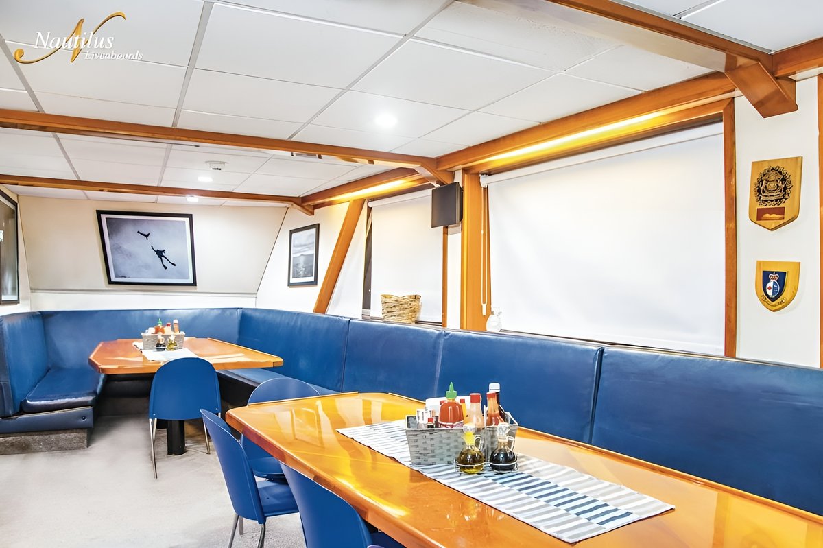 Die Nautilus Explorer verfügt über mehrere großzügige Aufenthaltsbereiche im Innen- und Außenbereich. Der klimatisierte Salon mit Panoramafenstern sowie der separate Essbereich bieten viel Raum auch während längerer Überfahrten.