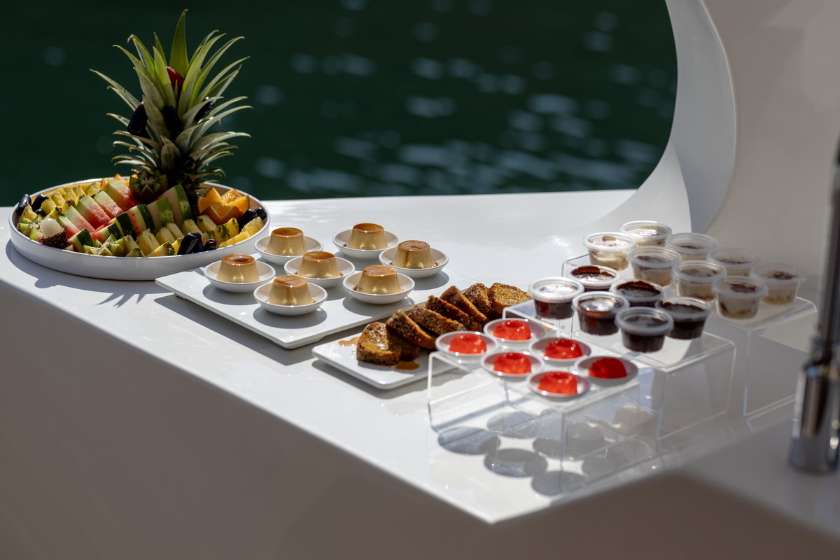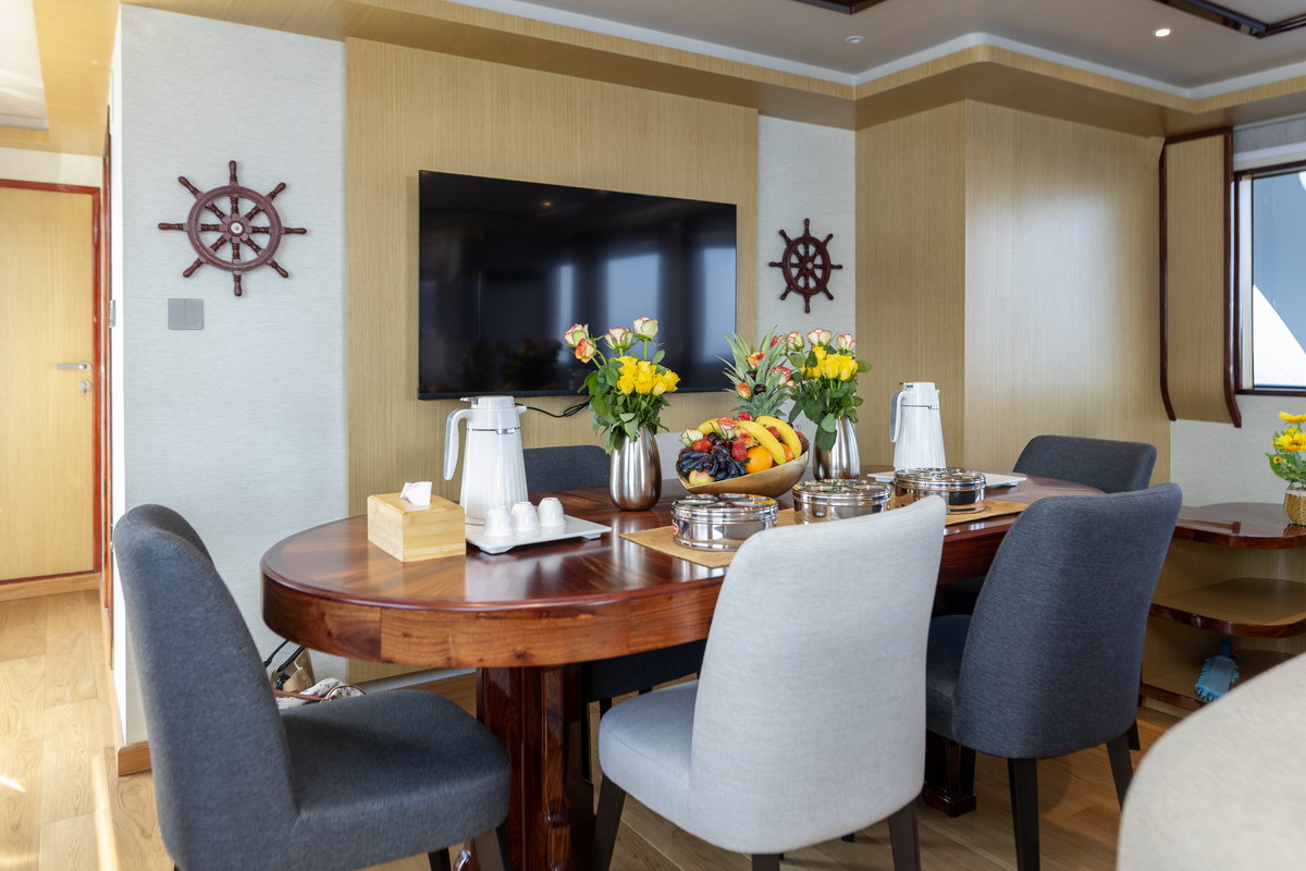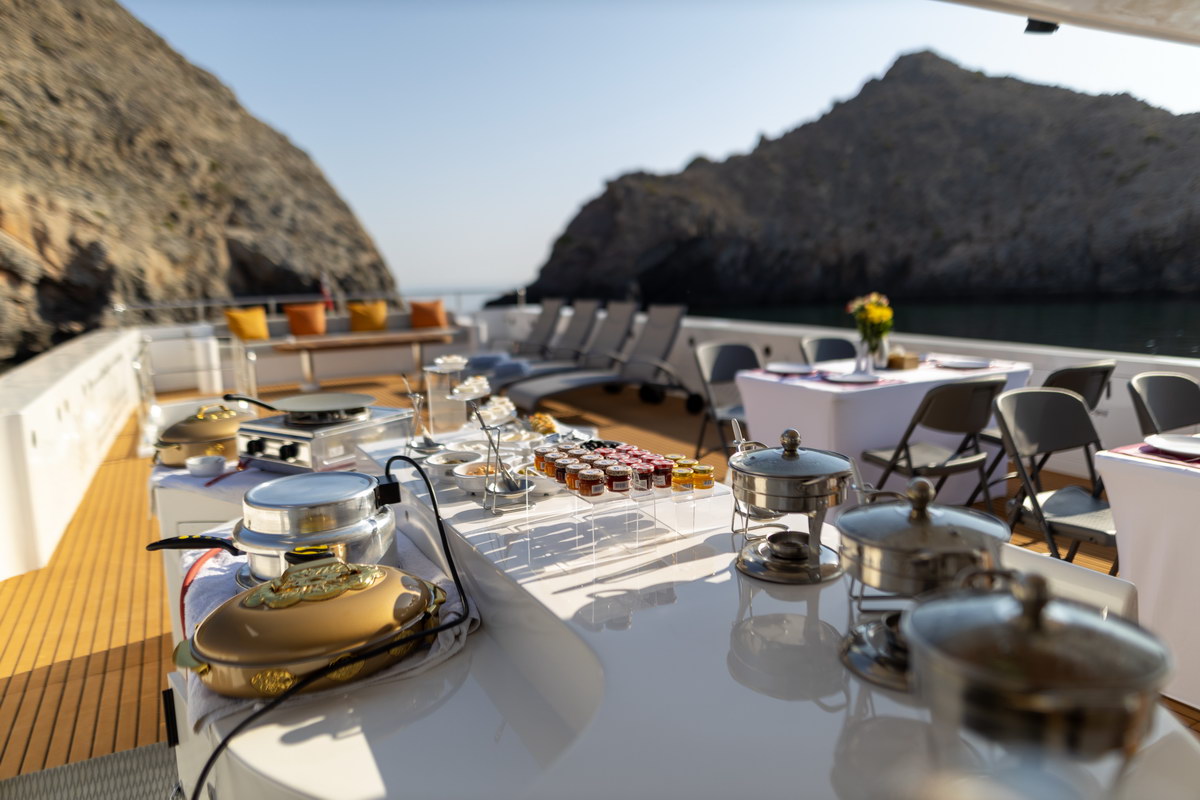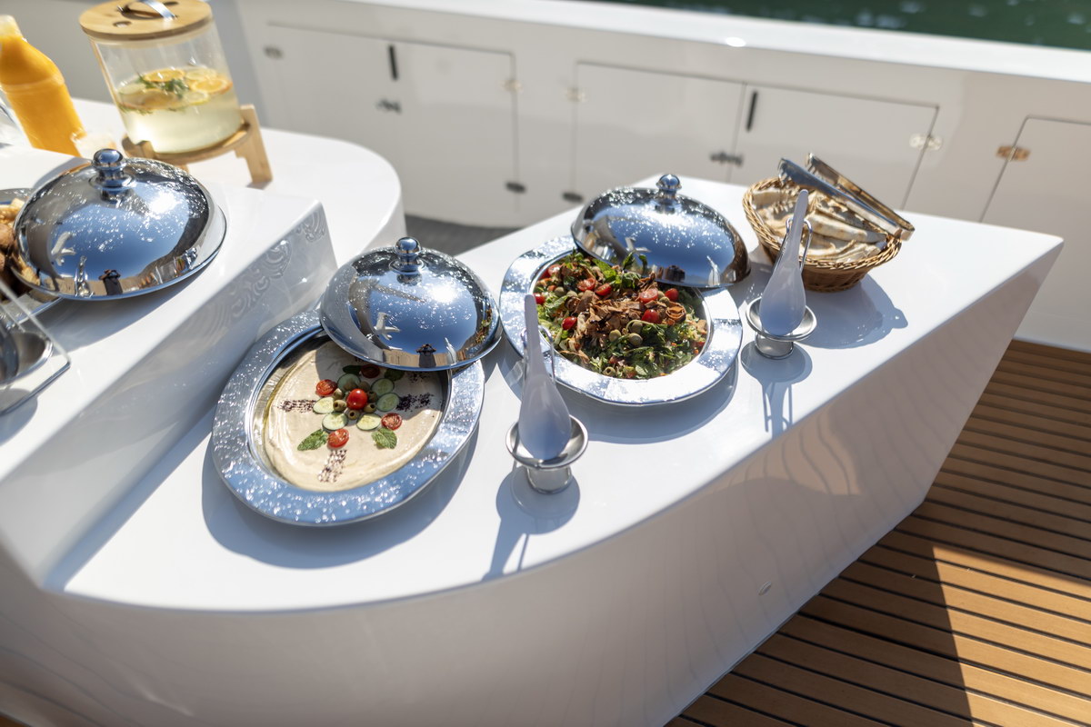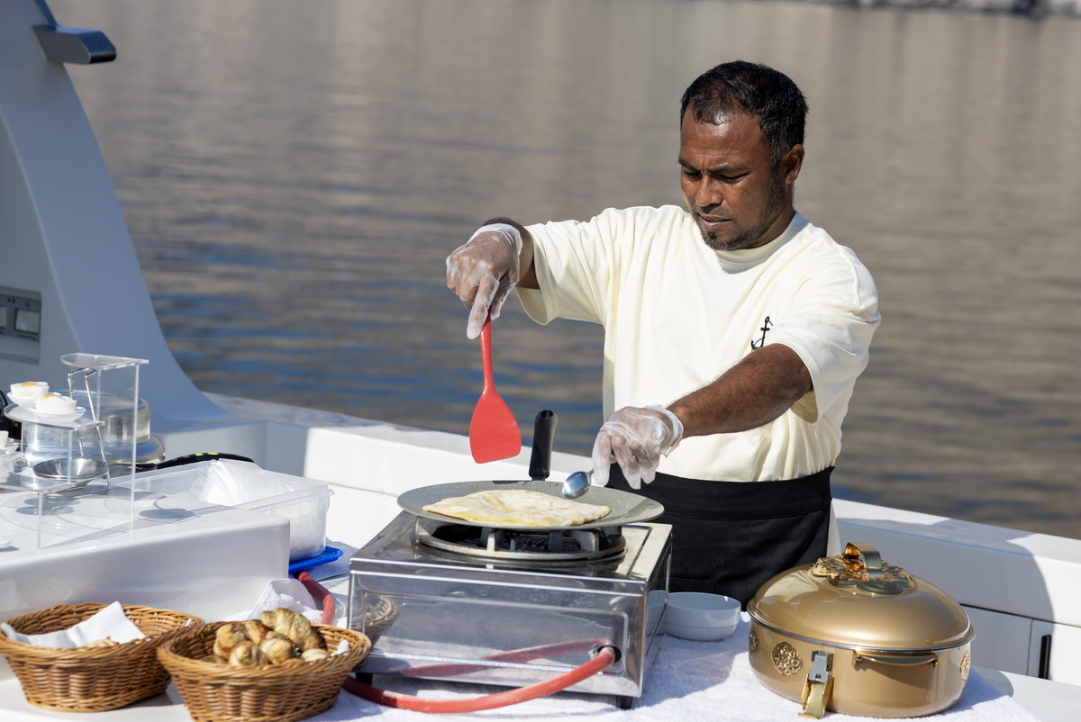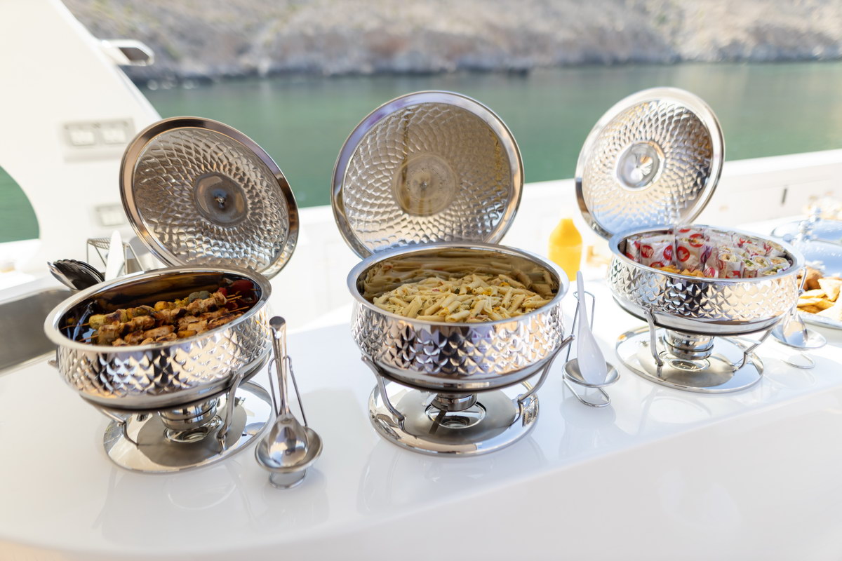 Gäste genießen Vollpension mit täglich frisch zubereiteten Mahlzeiten, ergänzt durch Snacks und alkoholfreie Getränke. Besondere Ernährungswünsche wie vegetarische, vegane oder glutenfreie Kost können nach vorheriger Absprache erfüllt werden. Alkoholische Getränke sind gegen Aufpreis an Bord erhältlich.