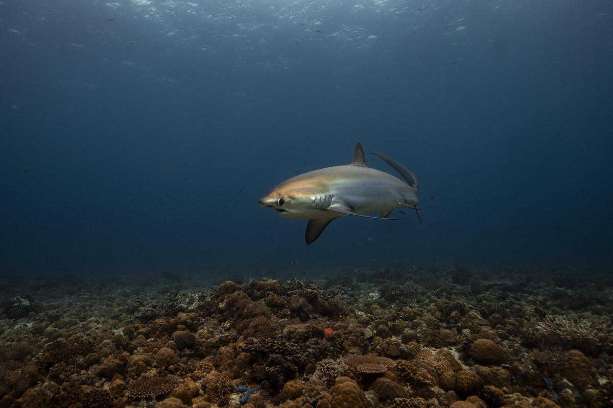- Eine 30-minütige Bootsfahrt bringt Sie zum Shark Point an der versunkenen Insel Monad. Sie beginnt in einer Tiefe von 12m und verläuft rundherum steil abfallend bis auf 45m. Dorthin führen die Early Morning Dives, weil es fast jeden Morgen Fuchshaie zu sehen gibt. Aber auch Mantas und Hammerhaie können mit etwas Glück gesichtet werden.