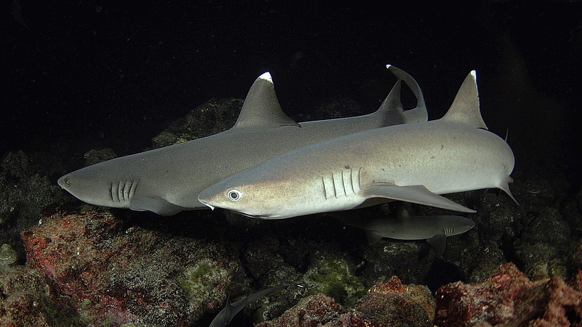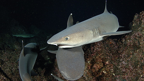 Darüber hinaus bereichern Fischschwärme von unvorstellbarem Ausmaß die Szenerie. Zwischen den großen und nur von Seepocken bewachsenen Unterwasserfelsen jagen Weißspitzenhaie im Schwarm und tausende Langusten suchen nach den Überresten der Haimahlzeiten. Große Rochen sind allerorts. In den Nischen lauern gewaltige Muränen, und selbst die Zackenbarsche trifft man in Gruppen.