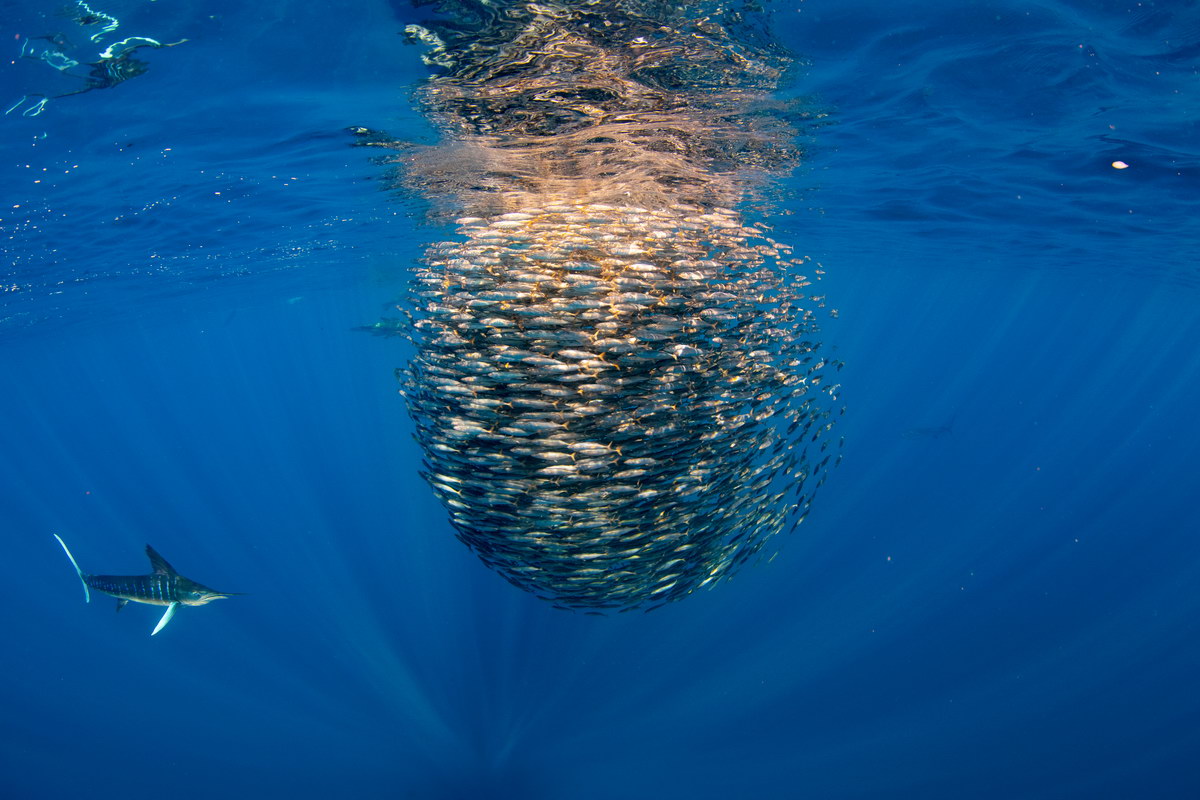 Dies ist ein faszinierendes Erlebnis, das schon allein die Reise wert ist. Am beeindruckendsten ist aber vielleicht die Möglichkeit, mit dem sehr seltenen Gestreiften Marlin, einem der schnellsten Fische des Ozeans, im Wasser zu sein. Auch dieser wird nämlich von den Köderbällen angelockt. Gestreifte Marline gibt es nur in den gemäßigten und tropischen Regionen des Indopazifiks. Sie können über 4 Meter lang werden und über 200 Kilogramm wiegen. Sie sind leicht an ihrem speerartigen Oberkiefer und der großen Rückenflosse zu erkennen. Ihr Oberkörper ist an der Oberseite dunkelblau bis schwarz und an der Unterseite silbrig-weiß. Sie haben Reihen von blau gefärbten Streifen, die aus runden Flecken oder schmalen Bändern bestehen. Taucher können manchmal mehr als 30 Marline auf einmal sehen, die abwechselnd zu einem Köderball stürmen, um die Sardinen zu erbeuten. Manchmal springen sie bei ihrer Jagd sogar aus dem Wasser.